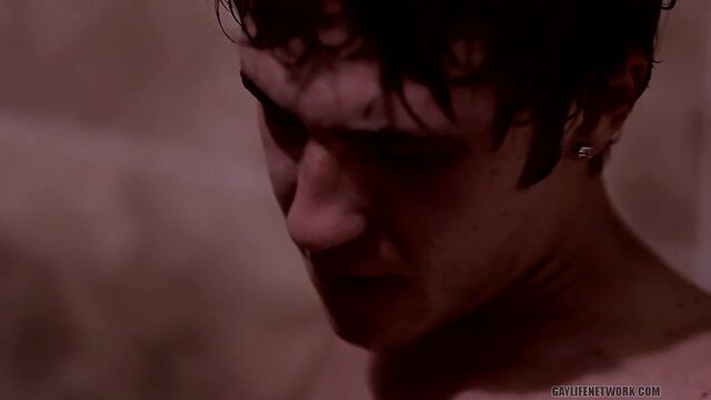 Vampire Kain Lanning is prowling the streets when he comes across Jonathan Cole, who's looking for some company. The two end up back at the house in the shower together, trading oral and eating each others asses. The vampire bends Jonathan over the sink to fuck him doggy style before taking him missionary, as well. Kain even gets his own ass fucked by Jonathan before the two blow their loads all over Jonathan's stomach.