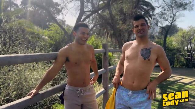 You can see when Ozzy takes his top off in the shade he's quite humble about his athletic chest... while Brysen waves his shirt around and hams it up for the camera! Despite their different styles, these guys agree they want to get their hands on each other. In the bedroom, Brysen whips Ozzy's clothes off in seconds and drops to his knees to suck him. "It's gonna feel so fucking good in my ass," he groans. "You take it like a pro," Ozzy responds, then puts the bottom on all fours to rim his hole. Brysen's soon begging to get fucked, and Ozzy gives him just what he wants from behind and on his back, then lies back so the bottom can ride it! Brysen cums as Ozzy gives him every inch in piledriver, then asks for a hot load on his hole.