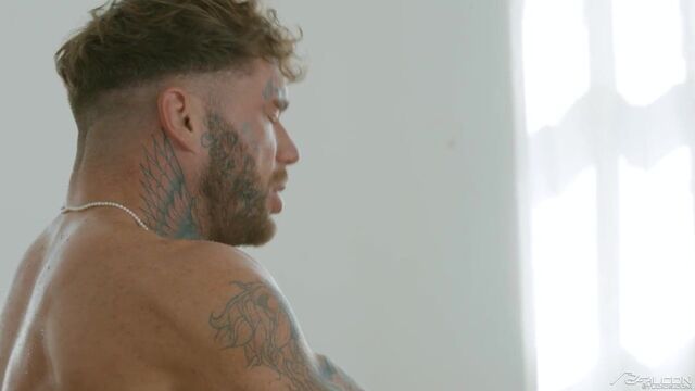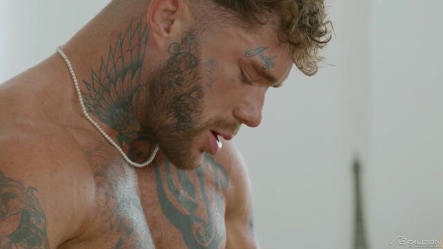 Joel Hart is tidying up his lavish studio when Dean Young comes over to create some content. To get the right shot, Dean calls on Joel to help him with some pies for his fans. While Joel is snapping the photos, he can't help but notice hot turned on he is by Dean and leans in for a kiss. The move is eagerly welcomed by Dean, and it's not long before they both strip off each other's clothes, and Joel gets to work rimming Dean's smooth hole. After teasing Dean's ass with his tongue and fingers, Joel feeds Dean his thick uncut cock. Joel can't wait any longer and Dean wants cock now, so Joel bends the smooth muscle-twunk over the chaise and pounds his ass bareback. Dean's hole wants more as he gets on top and rides Joel's cock down to his balls. Riding hard and fast, Dean bursts his load with Joel still inside of him. Hopping off the cock to have another taste, Dean wraps his lips around Joel's hefty cock that's fresh out of his ass. Deepthroating every inch of the sexy tatted stud, Dean gets Joel to unload a thick load straight in his mouth.