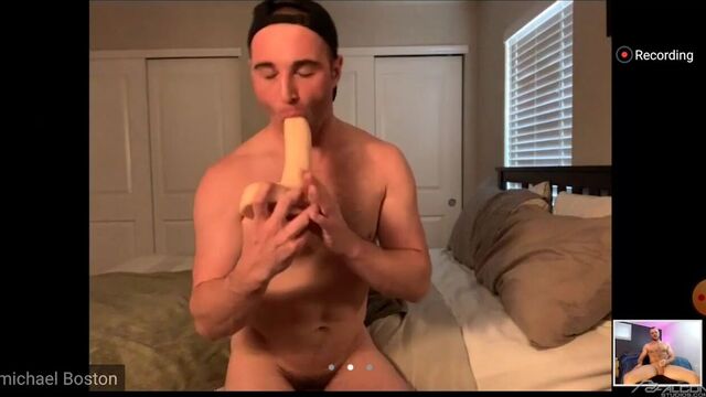 When hung daddy Wade Wolfgar hits you up on video chat and asks if you have time to help him with his raging hard-on the answer is always YES. Just ask Michael Boston, the handsome young stud with an award-winning bubble-butt. Michael is all too eager to strip and show off, sucking on a giant dildo and stroking his own rock hard cock while Wade jerks off and tells him exactly what to do to get them both off. Michael lies on his side and opens his rosy hole to the thick fake cock, pushing in all 10+ inches to the base. Both guys pull in close and jerk off for each other until they both blow.