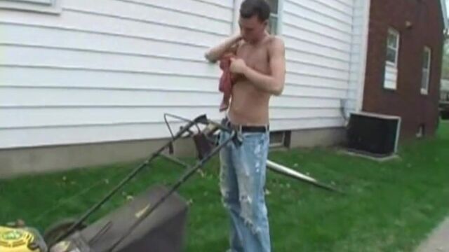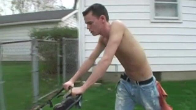 19 year old yardboy Jared Long, hot and sweaty after mowing the lawn, cools off (and jacks off) to relax!