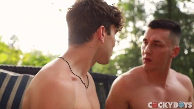 Newcomer Achilles is back---for some hot outdoor sex with CockyBoys Exclusive Tristan Hunter, someone who fits the bill nicely for Achilles' likes and desires. For starters Tristan comes out on the porch to kiss Achilles sweetly and suck him passionately and self-described "people pleaser" responds by going down on Tristan with equal fervor.Achilles is revved up even more when Tristan fingers and tongue fucks his hole---so much so that he virtually demands that Tristan replace his tongue with cock. Tristan's big dick turns out to be an eye-opening experience for Achilles not just for its size but how Tristan pounds his hole. And, just as Achilles likes, Tristan dominates him and gets him to ride his cock---which Achilles does enthusiastically.When Tristan flips him on his back, Achilles reacts like it's his first time but truly he enjoys the hard, passionate pounding. As Tristan gets close, Achilles wants a facial---and gets a cum shower! Right away Tristan attends to helping Achilles to cum, and what really puts him over the edge are Tristan's kisses--- which continue well after Achilles shoots. Just two more satisfied guests at Camp CockyBoys!Enjoy, Jake Jaxson