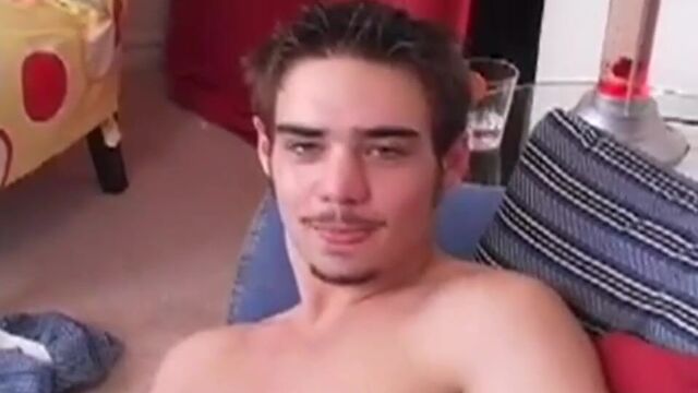With his spiky hair, devilish grin, playful eyes and a sexy lean body, 21-year-old Zack looks like the guitar player from a boy band, as proud to show off his new facial hair as he is to brag about what he does with groupies. In short order, he begins working up his t-shirt, exposing that flat stomach and that sexy trail of hair that begins under his navel and dead ends into nirvana just below those dark blue boxers. Zack makes history of the shirt, tossing it over his shoulder and, owning the moment, relishes the chance to be the very object of desire to the fullest. His chest is marble smooth, his nipples hard, and as he flexes his chest, the tight musculature of his body gleams like a living anatomy chart of what a hot college guy in his prime can look like if he was blessed from the right end of the gene pool. His is naturally lean, effortlessly defined and possesses a set of abs that wet dreams are made of. Wiggling out of his shorts and giving a good solid grasp to that growing mound in the middle, it is clear Zack now has something else on his mind...and in his fist.Like a gigolo beyond his years, Zack works the nuance of every pose, letting the waist band fall so seductively on his lower abs. He lets us appreciate the defined arch of his obliques before turning around, showing off those well-toned arms as he works the boxers down, and revealing inch after inch of rock hard, creamy white, jock butt cheeks as round as they are tight and just as hot as they come. Keeping his meat covered, he works the anticipation to the fullest until we are almost afraid that what is below might be the fly in this otherwise perfect ointment---but fret not! He pulls his hands away and what appears is a solid, thick, cut, bona-fide two-fisted boner of delight.Thankfully bucking the trend and letting his dark brown bush grow free, Zack's cock is unlike the rest of him in one respect: his body is thin as can be and that cock is as thick as they come. Not just thick, it is veiny, meaty and long. With a set of heavy hanging balls, his shaft is almost as wide around as both of those nuts are together. When he grabs the shaft low at the base, it becomes a throbbing red tower with a flaring head that threatens to spread precum on his own nips. Working up a bit of sweat with the intensity of the feeling he is creating, he looks right into the lens to make sure you know this is no act on his part; that cock is making him feel that good and oh yes, he is glad you are along for the ride. On the floor, in the chair and finally sprawled back on the couch, Zack hammers away at that nut until he finally explodes like a geyser all over that still heaving chest and belly. Wonder how much he would shoot if a mouth worked that pole instead of just his own hands? Stay tuned guys. We will be back with a visual!