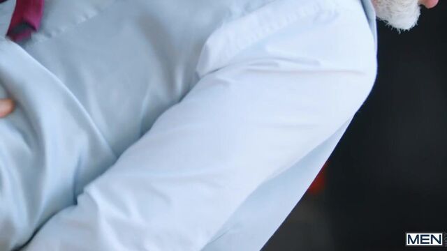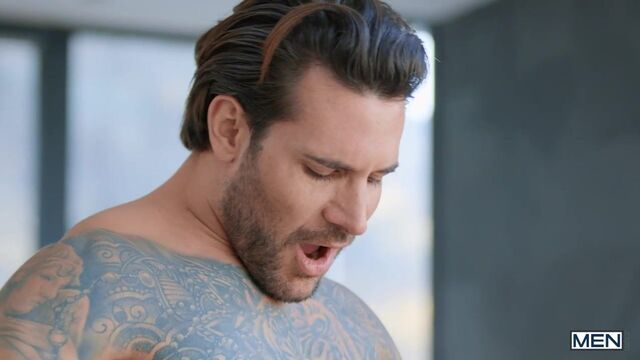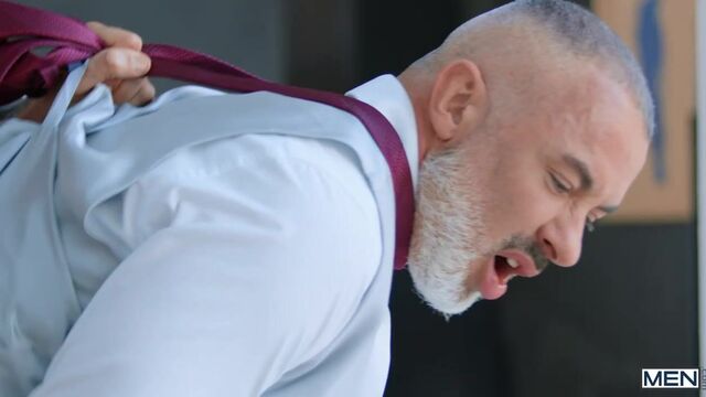 Papi Kocic's resume is impressive, but he thinks he's got something job interviewer Adam Franco will like even more: his big, hard cock. The tattooed top takes it out and strokes it, then grips Adam's tie as he makes the bottom suck him. Papi takes the initiative to bend the interviewer over the conference table and tease his hole, then fucks him doggystyle. It's a good sign when your interviewer is on his knees worshipping your cock and balls, then riding your dick! The bottom cums as Papi fucks him doggystyle, then the top pulls out and shoots on his ass.