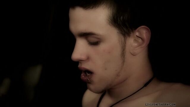 Kain Lanning and Ryan Sharp kiss in the kitchen before Kain sits down to let Ryan suck his dick. The lip-pierced stunner works over the vampire's dick before getting his own cock wet. These two make use of the island in the kitchen by fucking all over it. First Kain takes Ryan like a dog before getting him flat on his back. Ryan cums while he's being fucked just before Kain squirts all over his chest.
