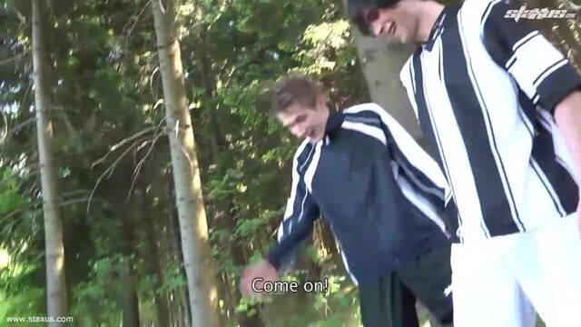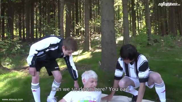 - Description: It’s not unusual for fans to sometimes become a little obsessed with their idols, but even so young bottle-blond, Nick Kelson, takes his devotion to a whole new level when he decides to start jerking himself off whilst soccer stars Ben Rain and Julien Adagio enjoy a training session in the local park. Of course, this being the Czech Republic it’s not long before Rain and Adagio have spotted their erstwhile supporter – whose hair strangely matches the colour of their strips! – and are taking full advantage of the horny beauty by asking him to suck their swelling cocks. A few more moments on and Rain is sliding his thick, uncut ramrod deep into Kelson’s unprotected ass, resulting in a superb outdoor spit-roast that’ll have you tugging on your dick in no time. Clearly not wanting to be outdone by his team-mate, Adagio then promptly encourages the hungry bottom to sit on his shaft cowboy-style; before both lads take it in turns to hump him from behind. Little wonder that Kelson’s soon spurting his load; before first Rain and then Adagio splatter the dirty bitch’s face in cum and piss!