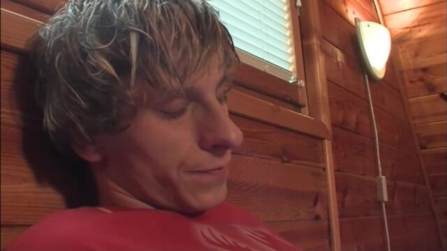 Tall and lean, our blond biker Elliot strips out of his gear for a sly wank, playing with his huge boy cock. His pretty mate catches him at it, and wraps his hungry mouth around this massive member.