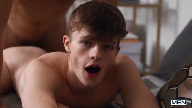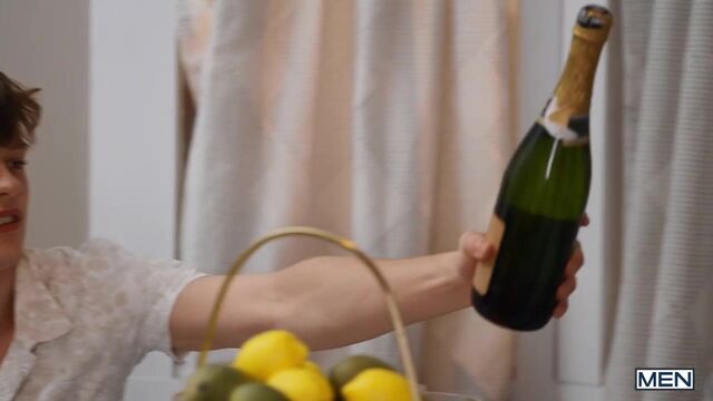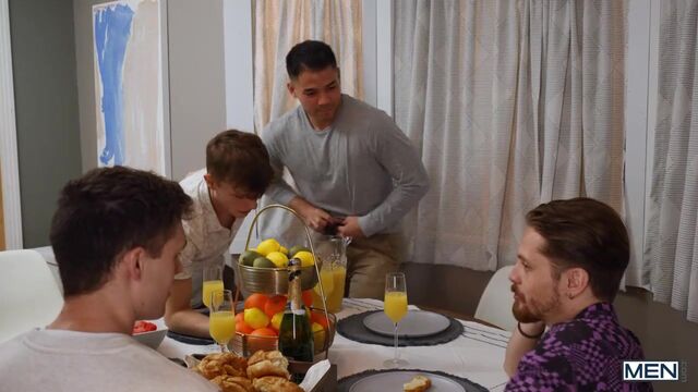Horny bottom Jake Preston is desperate for some dick, but his boyfriend won't give him any before their friends arrive for brunch. Jake sets his sights on hottie Colton Reece, grabbing a handful of Colton's cock while he hugs his BF hello. Jake takes every opportunity to get his hands on Colton, and even pretends his back hurts so the physical therapist will rub him down. Soon the guys are sneakily fucking at the table! Jake takes Colton to the bedroom and sucks him, then the top rims and fingers his tight hole. Colton fucks the bottom doggystyle and in missionary, even hoisting him up for a stand-and-carry. He cums in Jake's mouth, then Jake cums on Colton's cock and sucks it off!