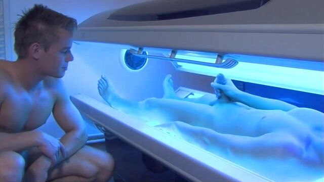 Novak is laid on a sunbed when Black's hand reaches in and begins to stroke his heavy uncut cock. Black sucks it until it is hard and then bends Novak over a chair and fucks him. Novak takes Black's very big load straight in his mouth.