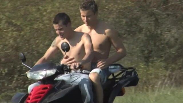 The final caller to the talk show wants a date with the host - and gets one. In an outdoor scene, the two ride around on Alex's quad bike. Alex is 20 years old, small, dark and has tattoos on both upper arms. He flips Arny's apparently tiny cock out of his pants and takes it in his mouth. It soon grows to a big fat one which Alex takes up his tight arse, and the suspension on the quad bike is severely tested as Arny pounds him hard. Alex finishes him off with a hand job and takes Arny's load in his mouth.