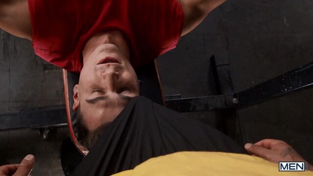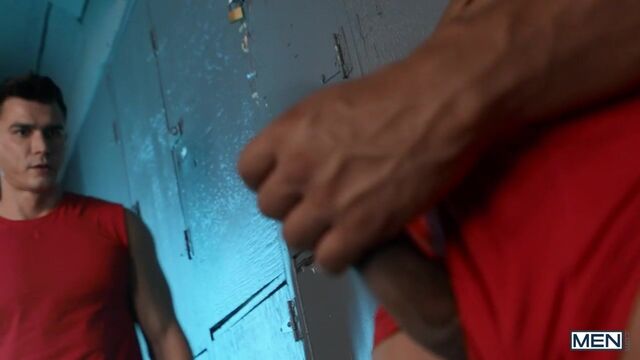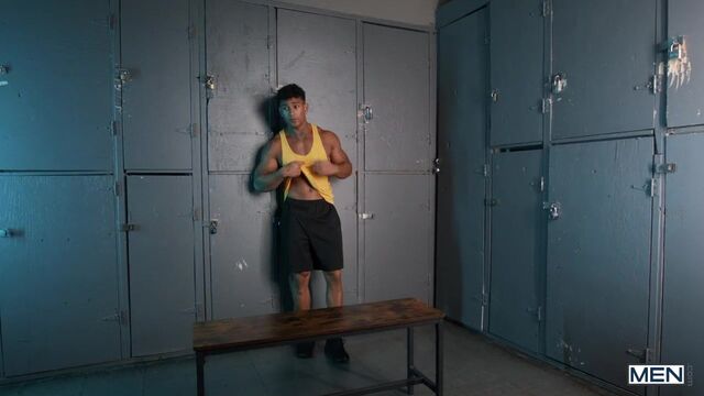 Mister Deep Voice spies Kenzo Alvarez checking out a hot girl's ass at the gym and getting hard, so he asks for a spot, where he has a perfect view of that boner in his face. After Kenzo gets rejected by the girl, Deep Voice asks for another spot and grinds his muscle ass against Kenzo's bulge. The straight guy can't believe he was turned on by a dude, and as he jacks off in the locker room, the bottom sneaks in and sucks him. The deep-voiced hunk tells the top to fuck him doggystyle, then rides that dick on a bench. Mister Deep Voice cums as Kenzo pounds him on his back, then takes a thick facial.
