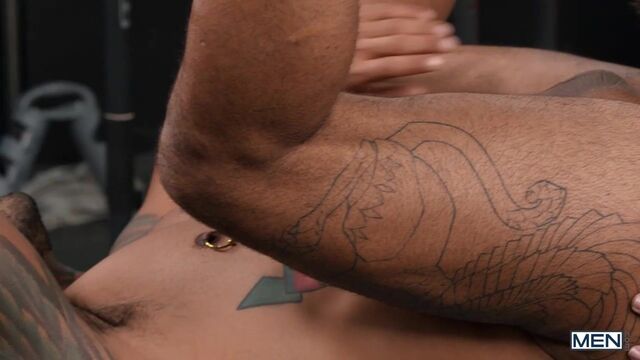 As Thomas Johnson lifts dumbbells in the gym, his attention is drawn to the colorful tattoos and pierced nipples of the other man in the weight room! Babylon Prince draws nearer, kissing Thomas and letting his hands roam over his muscles. The guys suck each other, and Babylon rims Thomas, even having the hunk sit on his face before Thomas tongues Babylon's hole. Thomas fucks the tattooed stud missionary and doggystyle on a bench, and Thomas wants that dick in him too, so Babylon gives him every inch from behind before Thomas rides him on the floor. The flip fuck continues as Thomas tops again, pounding Babylon's hole till he shoots a huge load before Thomas pulls out and cums.