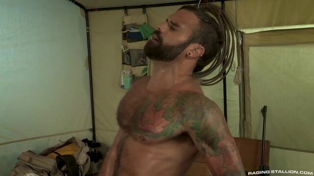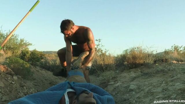 Drake Masters needs to face his actions, in exile in the desert. He thinks he's alone, but the wind carries his scent to a nearby campsite where Drew Sebastian is polishing his big weapon. Drew finds Drake and takes him back to his tent, where the older, wiser wolf daddy educates the pup in more ways than one, starting by aggressively rimming Drake's fine jockstrapped ass. Opening his hole with his tongue and thumbs, Drew prepares Drake to take his ginormous cock in a hardcore bareback ass pounding. Drew totally owns and dominates Drake's fuck-hole 'Stay there! Good Pup,' and uses the jock waistband as a handle to maneuver a grunting Drake onto his titanic tool. Going ass to mouth, Drake tries to deepthroat Drew's unforgiving cock and gets throat-fucked, till Drew finally lies down and Drake hops on top, riding the bearded stud with all the secret tricks his hungry muscle-butt knows. Deep drilling finally takes a load out of Drake, who feeds his seed to his wolf daddy. Drew laps up every drop and blows his own orgasm, then Drake nurses his spent cock and they rest.