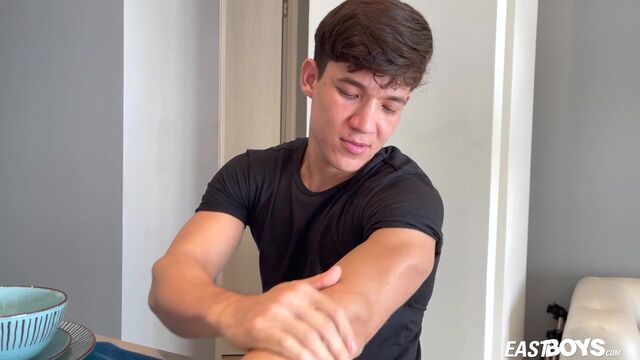 Robin Zanders is one sexy dude, with nice muscular body and well formed pecs, no doubt created by years of street workout. Mr. Hand Jobs is using oil to prep Robin's body for what will be coming next, guess what that will be. First massive cock comes out, then look at those balls... and action!