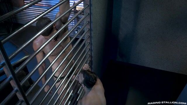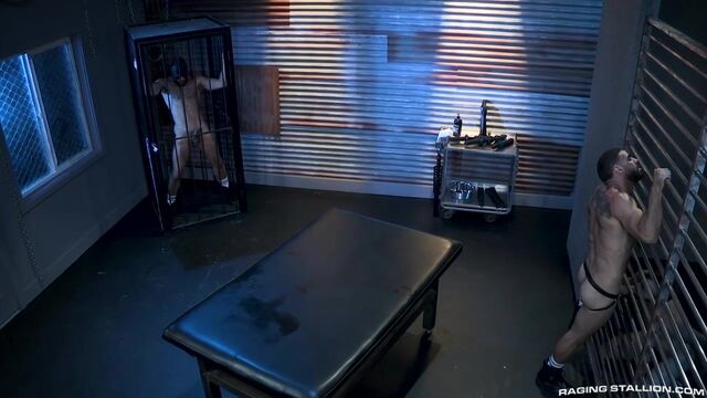 Mason Lear is stroking behind bars and Donnie Argento is masked and locked in a steel cell. Ricky Larking discovers the guys ready to fuck and slides his cock thru the bars on Mason's end. Donnie watches from the other end of the room as Mason fits his head between to bars to get to Ricky's meat. Not wanting to leave Donnie out, Ricky unlocks his cage and attaches a metal leash to Donnie and leads him on top of a table on all fours. Teasing and taunting the masked stud, Ricky sacks and sniffs Donnie's fuzzy hole as Mason watches with his cock in his hand. Donnie submits to every sniff, lick and probe Ricky is throwing his way. He rolls Donnie around onto his back and shoves his raw cock in and Mason tries to fight his urges from behind the bars. Mason has had all the waiting around he can take and joins Ricky and Donnie, feeding Donnie his thick rod while Ricky keeps fucking his ass. When Donnie wants a break from getting spit-roasted, Mason takes his place to let Donnie fuck his bare ass while sucking down Ricky's member. Donnie and Ricky take turns plugging Mason's ass before Donnie becomes the bareback bottom again, getting pile-drived by Ricky. Mason wants one more stretching and lays back to receive Donnie's cock in his hole. He keeps pounding until both Donnie and Ricky paint Mason's hairy hole with their warm loads. Making sure not to forget about Mason, Donnie shoves his cock back inside him as Ricky rims Donnie's hole. Mason strokes his cock until it lets out his creamy load.