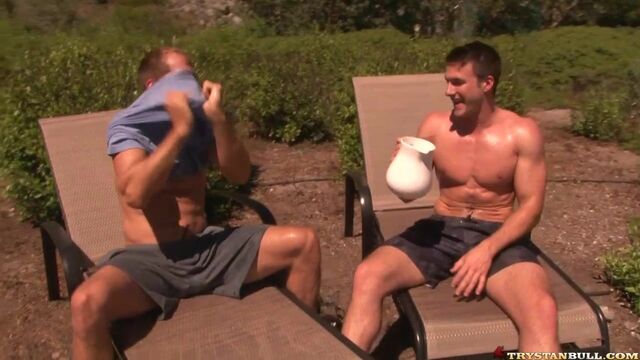 Trystan Bull is showing off his gardens to Brandon Lewis one fine summer day, the two of them just taking a leisurely stroll amongst the flowers. Trystan is walking Brandon through the watering process, and before long, the two of them start dicking around with the hose. After cooling off and relaxing, Trystan realizes which hose Brandon really wants to mess around with, and before too long, Trystan is draining that hose as well. Enjoy!