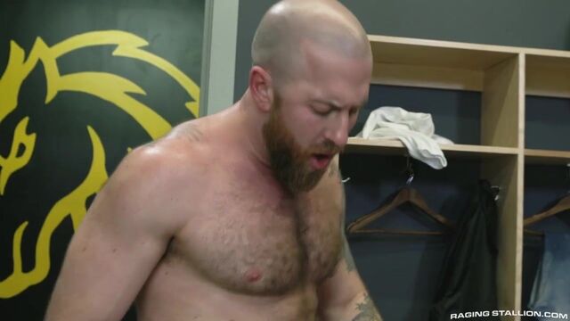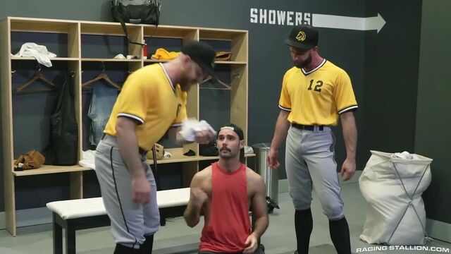 During the Stallions game Anthoni Hardie slips into the locker room to sniff the team's dirty jocks. He hits the mother lode when he finds a laundry bin stuffed to the brim with old smelly jocks. Ball players Nigel March and Donnie Argento catch the culprit in the act. When Anthoni asks for a couple to take home, Nigel offers up his own sweaty sack for Anthoni to sniff. Anthoni gets on his knees between the two hung baseball players and goes back and forth sucking each of their musky dicks. Donnie wants in on the ball action and moves past first base to get Nigel's thick cock down his throat. The hunks form a rim train with Anthoni in the middle, both sucking ass and getting eaten out. All the ass eating gets Donnie in the mood to fuck bareback and he moves to the scoring position with his ass in the air. Nigel steps up to the plate and drills Donnie hard, sinking his cock deep into his teammate's open, raw ass. Anthoni feels left out and bends over under Donnie to give Nigel all-access to two tight holes. Nigel plugs both studs hard alternating holes until Anthoni flips over to watch his aggressor fuck him deep. Nigel hits just the right spot and makes Anthoni cum while he's getting fucked. When Nigel sees Anthoni's mess, he pulls out and blasts a load all over Anthoni's thick, black pubes. Nigel finishes and goes directly in for a double play when he slides his cock back into Donnie and fucks his buddy until Donnie slathers himself with his creamy white cum.