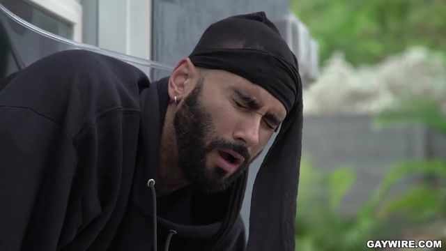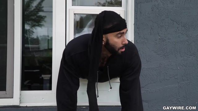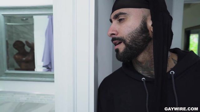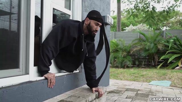 Rikk York seizes the opportunity to break into a house. Little does he know the owner is in the house. Aaron Trainer is busy taking a shower. Rikk stops right in his tracks when he spots Aaron's fit body in the shower. Rikk can't help himself, He pulls down his pants and starts jerking off his cock. Aaron finally notices and freaks out. Rikk tries to make a hasty escape and gets stuck on the doggy door with his pants still down. Aaron takes this opportunity to turn the tables and makes this home invasion into an ass invasion. Aaron lubes his ass and fucks him while stuck in the door. He helps the thief get out of the door and teaches him a lesson with his big black cock.