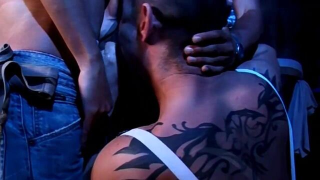 The dark corridors and rooms of the sex club are a great place to get your fix! With massive uncut cocks out for jerking and sucking the men gather and share their boners, feasting on shaft and getting plenty of precum from each other. That's not enough though, soon the pissing starts! With faces and bodies wet and glistening the men continue their feast of dick getting ready to shoot their cum for each other!