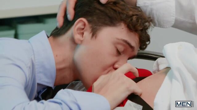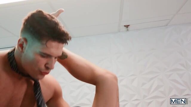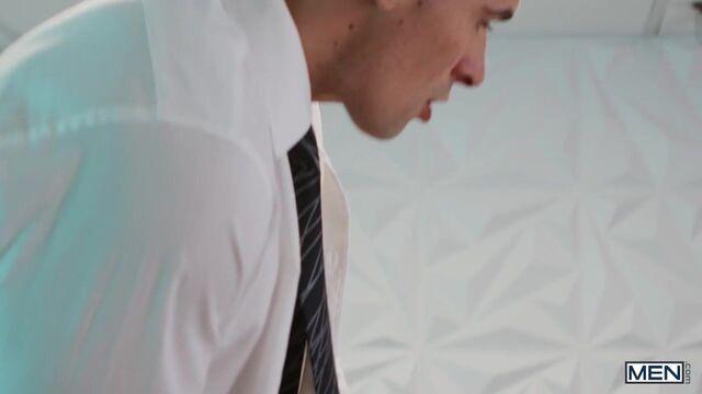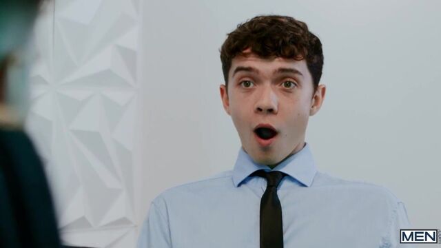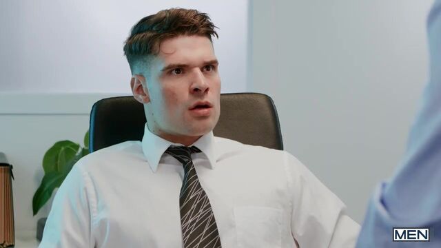 Sam Ledger's boyfriend leaves him an unforgettable surprise: a MenSexGear Saddle RC Prostate Stimulator to enjoy while he's away. Sam tests its limits, sliding the ultra-soft silicone design that can be controlled remotely into his hole before he gets dressed. But as its 10 unique vibration patterns come to life in the middle of his job interview, Sam finds himself in an unexpected and thrilling predicament. Malik Delgaty gets the full story out of the twink, and soon Sam is sucking the hot interviewer's cock and getting fucked on Malik's desk. Malik picks the bottom up for a stand-and-carry and flips him upside down to suck him. Primed by the Saddle's persistent vibrations in his ass, Sam cums as he rides the top, then takes a facial.