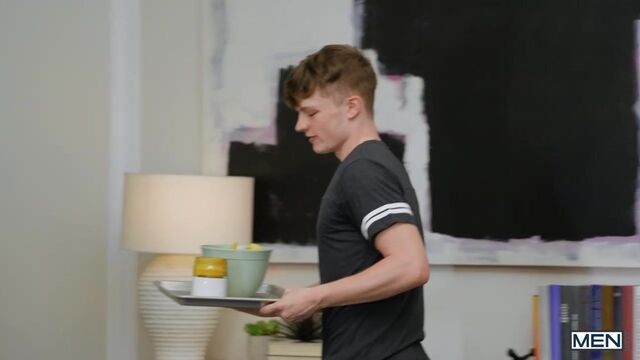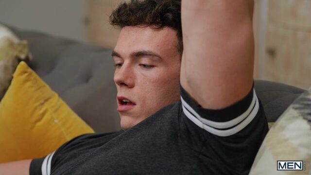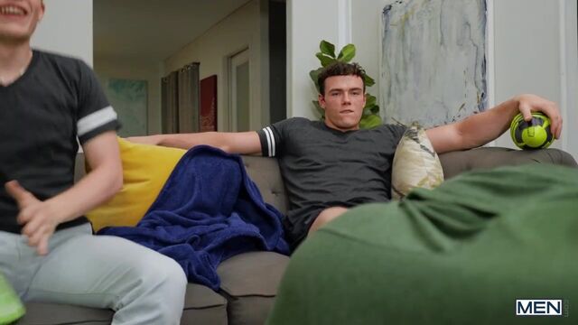 Trevor Brooks was looking forward to relaxing in front of the TV after finals, but his jock brother barges in with his buddy, Clark Reid, and steals the remote to watch the game while Clark makes Trevor sniff his armpit... but Trevor likes it! He makes sure Clark is soon watching his ass more than the screen, and Clark starts rubbing it with his foot. When his buddy leaves to make a snack, Clark can finally get his dick sucked, and then Trevor sneakily rides that cock under a blanket when his brother returns with the nachos. Clark fucks Trevor doggystyle, then pours nacho cheese on his cock and balls and licks it off! Then it's time to flip fuck as Trevor penetrates Clark, drilling him in missionary till he shoots a huge load before pulling out and cumming on him... just as his bro comes back.