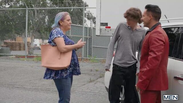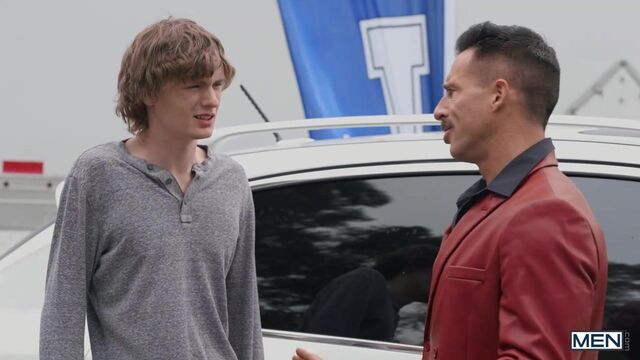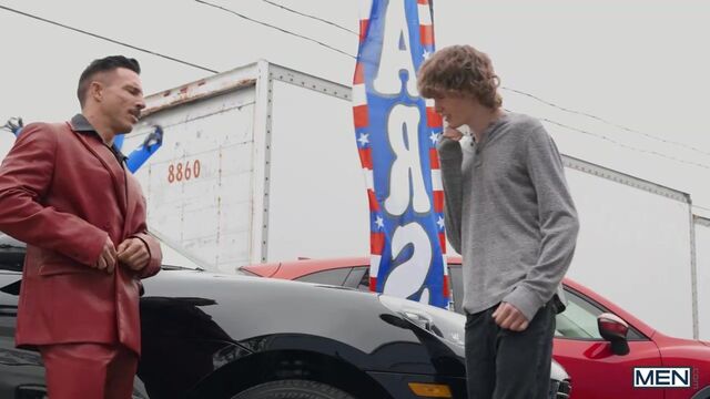When dedicated car salesman Reese Rideout spots a new customer browsing the lot, he heads right outside for the chance at a sale... or some tail. Spikey Dee needs a new ride for college, and he quickly sees just the car he wants. Reese sees what he wants too: the twink's mouth wrapped around his cock! He sneakily fucks Spikey bent over the trunk behind his mom's back, then brings him inside to ride his cock on his desk. Spikey even sucks his own long dick as he takes a pounding, and cums as Reese fucks him in missionary before the skilled salesman shoots a hot load on him.