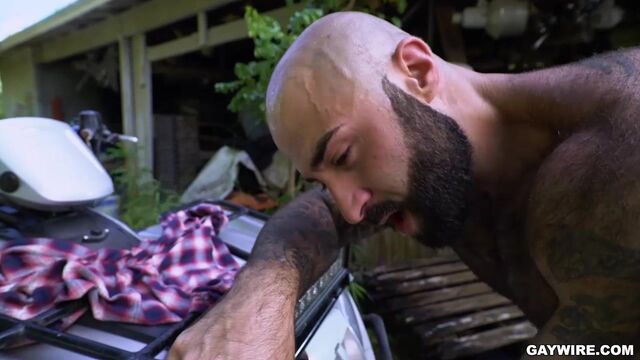 Atlas drives an ATV around his farm but he cannot resist to stop when he sees hot Phoenix, who is working, cleaning and moving stuff around. Atlas tells him to hop on because they have to do some work around the shed. On the way Phoenix gets turned on, he rubs Atlas's body, then he kisses his shoulders and keeps seducing him until he stops the ATV, from this point on they lost control, they keep kissing each other, then Atlas gives Phoenix a bj before being penetrated multiple times in different positions until Phoenix delivers a huge load all over his face.