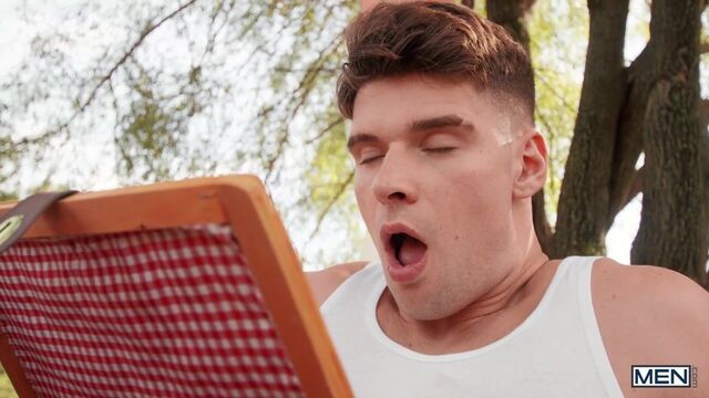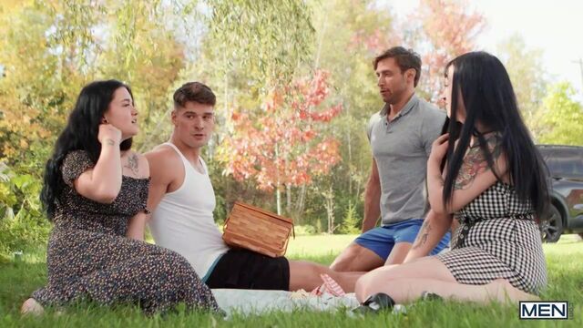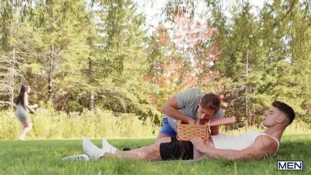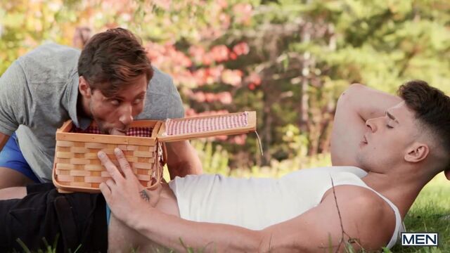 Malik Delgaty discovers a hole in the bottom of the picnic basket as his girlfriend sets up the birthday picnic she planned for her bestie. Malik is horny, but before he can do anything about it, the other guests arrive. The friend has a new BF in tow, Dom King, and when Malik sticks his dick in the picnic basket, Dom takes a look and eagerly strokes it! While their GFs play frisbee, the guys try a different game as Dom sucks Malik, then brings him to the car where he rims him and bends Malik over the seat to fuck his hole! Malik takes Dom's dick in missionary, then rides him. The top cums on Malik's ass, and Malik cums in Dom's mouth before the guys go back to their GFs.