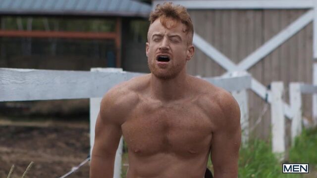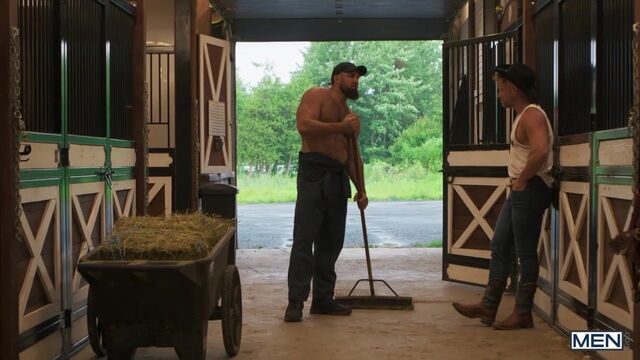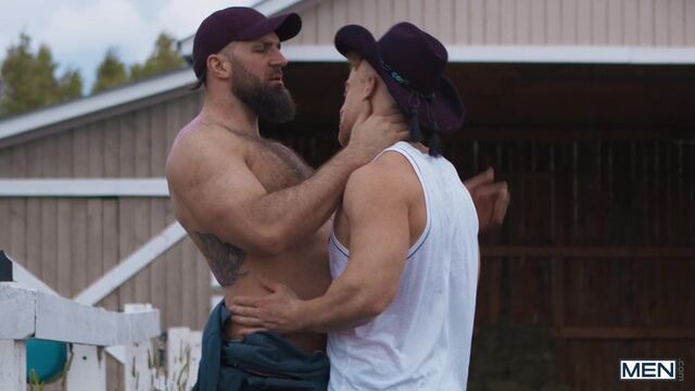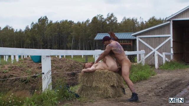 Years after leaving his home in the country without saying goodbye, Tim James is finally back... but he won't be accepted as easily as just putting his cowboy hat back on. Tim strikes up a flirtation with ranch hand Chuck Conrad, and the big burly hunk takes a break from his labor for Tim to suck his cock, then fucks the bottom over a hay bale. Tim gets pounded on his back, then cums as he rides that huge dick for all he's worth, and cowboy Chuck eases his blue balls with