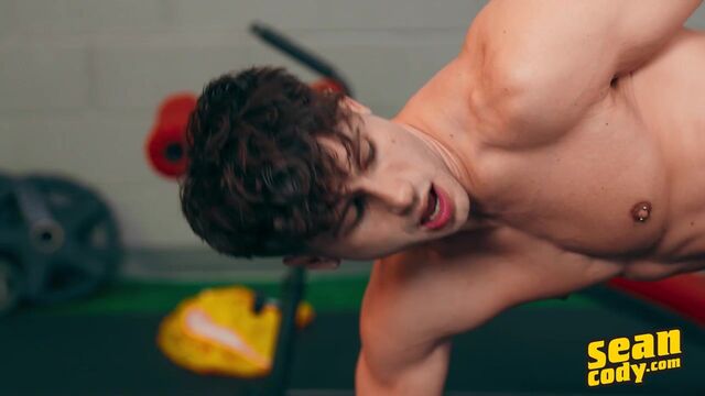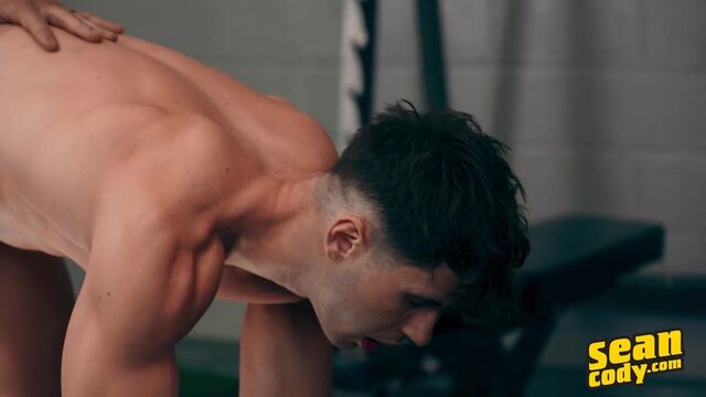 Michael and Sumner check each other out in the gym, and when Michael takes his shirt off, Sumner does the same. Michael escalates things, pulling down his shorts to show his ass, and soon has Sumner kissing down his back before rimming him and grinding his dick against the bottom's ass. "Oh fuck! It's so big!" Michael moans as Sumner fucks him. The guys join dark-haired top Axel, kissing and sucking him, and Axel and Sumner spit-roast Michael before the bottom gets double penetrated! They form a train and Michael cums as Sumner pounds him, then gets to his knees to take two loads on his face.