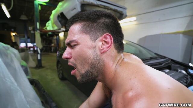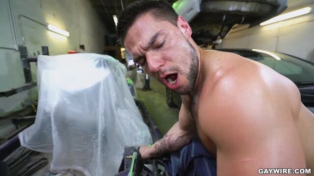 Hot, sexy Aspen just finished working on a vehicle, when the owner comes to pick it up, he realizes he cannot afford the bill, he asks Aspen for help finding another way to pay for the work, Aspen tells him, he knows a way in which he won't have to pay anything. They star kissing, then they suck each other dicks, at that moment Aspen decides there is a change of plans now he wants to be fucked, so the customer pounds him in many positions all over the mechanic shop but Aspen has a better idea, he wants to be fucked in a different way so he handles the customer a dildo adapted to a device so he can be properly drilled.