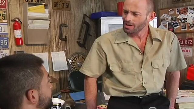 Garage boss Robert Black gives out-of-line grease-monkey Dominic Pacifico a dressing down and a good lesson in keeping his equipment well lubed and tuned up.