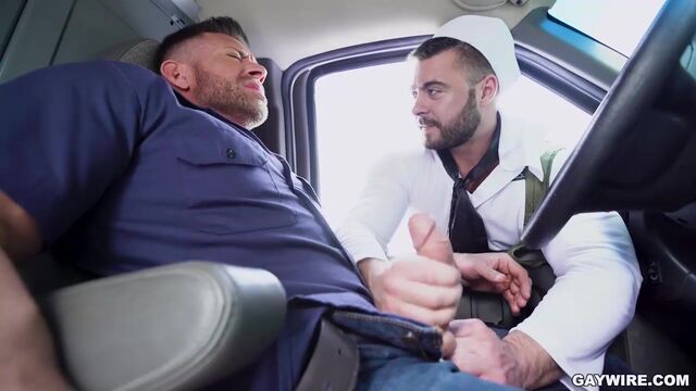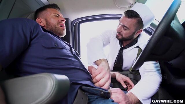 Derek Bolt was on leave from his navy job. He was trying to get home desperately. But it was a hot day, his phone died and nobody wanted to pick up a hitchhiker in a navy uniform. Finally he got lucky. A white van stopped. Bruce Beckham seemed nice but he had to go to a job in the opposite direction. Derek decided to try his luck. His hand reached for Bruce’s crotch and he said he would make it worth his while. Bruce stuttered that he was married and he would not do those kind of things. His dick was telling a different story. It was getting rock hard. Derek took the dick out and started to stroke it. Then he pushed Bruce on the passenger seat, jumped into the car and started to blow that dick. Bruce decided to fuck his job and go to his house instead. The two guys went straight underneath the shower. Here they soaped their hot bodies, sucked and fucked some. Then they took it to the living room sofa. Here they fucked very roughly until Bruce came in Derek’s mouth and then made Derek cum. Both guys had cum in their beards.