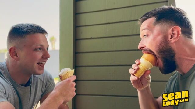 Deacon and Kyle play around by the water and enjoy a delicious ice cream cone before they have a taste of each other in the bedroom. Kyle sucks Deacon's cock, and the top instructs, "Keep sucking!" as he fingers Kyle's tight hole, before rimming him. Kyle wants that cock, climbing on top to ride Deacon. Then Deacon feasts his eyes on the bottom's muscular cheeks as he pounds him from behind while Kyle begs, "Fuck yeah, give it to me!" Deacon pushes the bottom against the wall to take him from behind till both guys reach an explosive orgasm, and he makes sure to lick his cum from Kyle's hole.