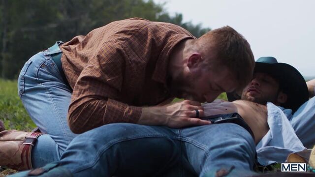 Cowboys Olivier Robert and Dom King fuck in the nature - Men
