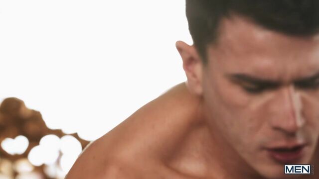 Hunks Papi Kocic and Thomas Johnson can't stop looking at each other and, of course, touching each other as they kiss, not even sparing a glance for the stunning view as they undress each other on the deck overlooking the city below. Thomas kisses Papi's tattooed chest and sucks his nipples. Inside, he deepthroats the top, hungry for every inch, then Papi rims the bottom and fingers his hole, getting him ready for his big cock. Thomas eagerly takes it in doggystyle and sits on it. He cums as Papi fucks him on his back, and Papi shoots a huge load on the handsome bottom's face and chest.