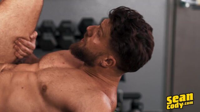Blond Sean Cody newbie Blake takes notice of bearded Heath when he comes into the gym, especially when Heath strips off his shirt. Blake comes over and kisses the bottom, and his dick is so hard it's soon coming out his shorts! Heath sucks it, then lies back on a block to get fucked before he rides the top. Blake lies on a bench while Heath sits on his face, then pounds the bottom against a weight rack before he pulls out and cums, and Heath cleans off the top's cock as he jacks himself off.