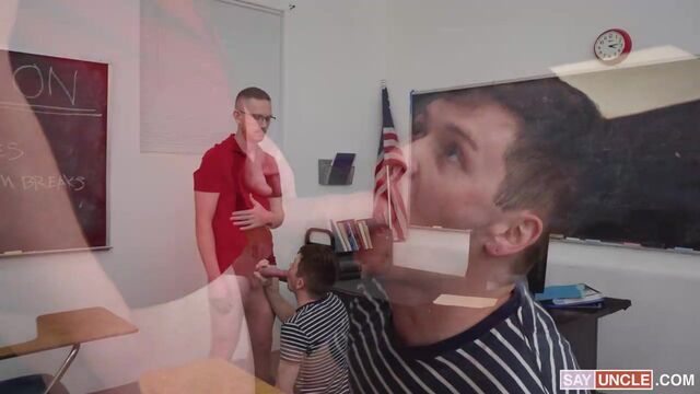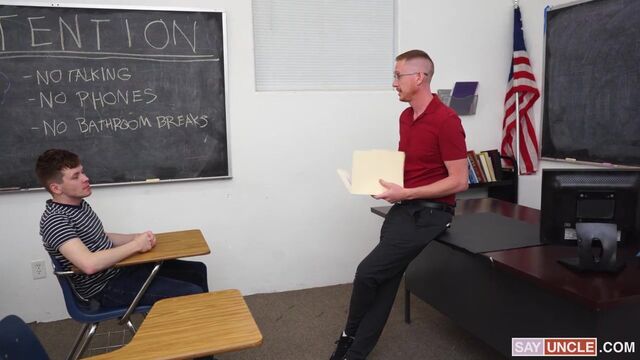 While in detention, Professor Kayman has a very serious talk with his naughty student Damian Rose. The boy claims that he didn’t steal his classmate's phone hoping to force him to do his homework, but unfortunately for the dishonest twink, Professor Kayman dials the victim’s number and hears it in Damian’s back pocket. When the twink refuses to give it back, the Professor really pats the boy down, causing him to have a boner. Suddenly, Damian realizes that Professor Kayman having his students’ phone number is not a coincidence, and discovers new things he can learn from his new favorite teacher…