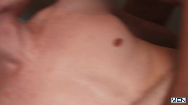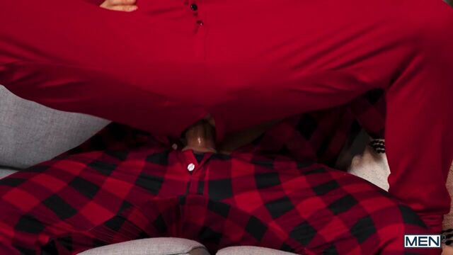 College student Jake Preston brought his boyfriend, Dom King, home for the holidays, but they have to sneak around! Jake unbuttons Dom's long underwear while Dom plays video games on Christmas morning, and sneakily sucks him, then Dom rims him through the butt flap of his own long johns! They hide their boners under a blanket, but Jake's mom catches him riding his BF's dick on the couch. Dom fucks the twink doggystyle and in spoon position, then pounds that holiday hole in missionary till they both cum.