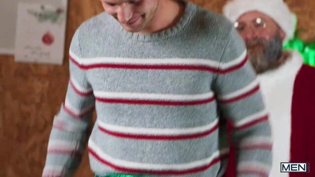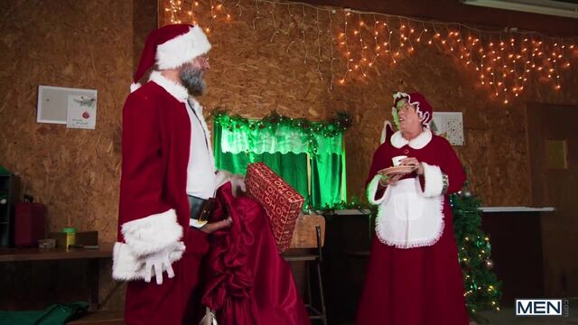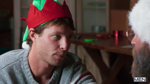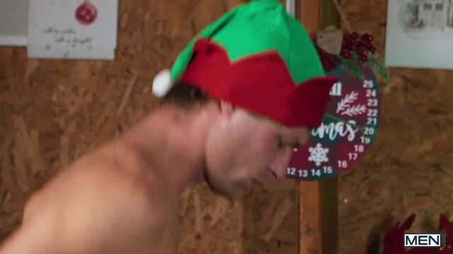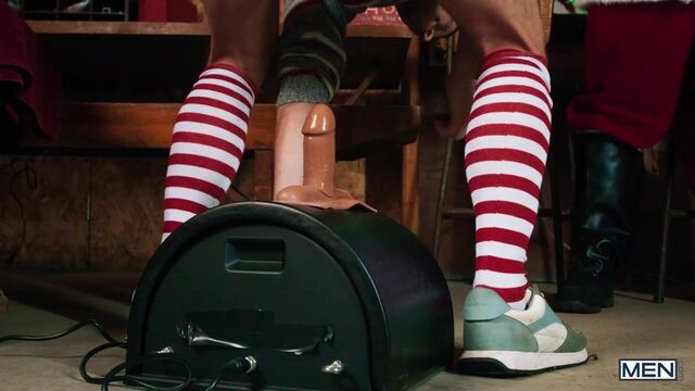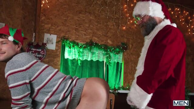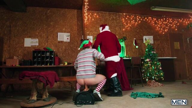 There's only a few weeks till Christmas, and at the North Pole, elf Benjamin Blue is hard at work on a new toy when Santa (Daddy Cake) comes in to check his progress. Santa tells Benjamin to test out the toy, and his helper happily plugs it in and rides it. Old Saint Nick can't help looking and getting horny, and the elf sucks his candy cane! When Mrs. Claus comes in, Santa hides Benjamin in his sack, and Mrs. Claus steals the toy to use for herself. Santa puts Benjamin over his knee for a spanking, then pounds the elf on all fours, and Benjamin lies back for a festive fuck. The elf rides Santa like a sleigh, then cums as he takes that dick doggystyle before Santa gives him a Christmas creampie.