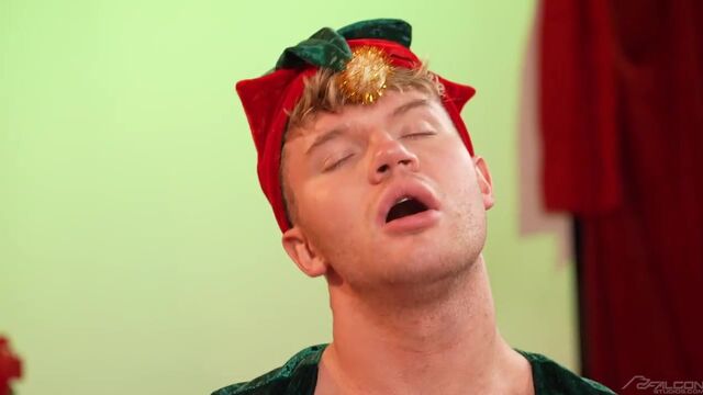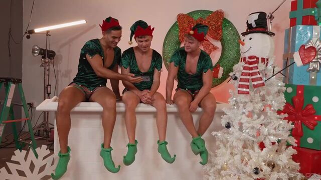 Horny elves Dean Young, Dylan Hayes, and Damian Night have all gathered to be part of a charitable photoshoot to help their favorite drag queens, Sherry Vine and Ethylina Canne, raise money to save Sherry's house. When left alone, though, the holiday helpers show off their naughty side with Damian breaking out his big dick for the other two to suck as he sits on Santa's throne. Dylan soon finds himself getting spit-roasted by Damian and Dean before the trio forms a bareback fuck train that has Damian pounding Dean while Dean drills Dylan. Then, with Dean in the middle, the threeway comes to a holly jolly ending as everyone unloads onto the Irish twink's gorgeous body.
