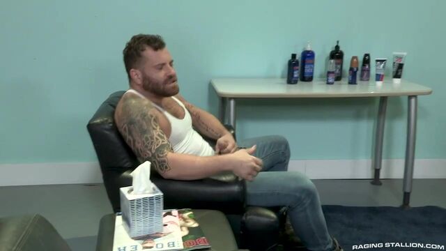 Co-workers Colby Tucker and Riley Mitchel get nominated by their boss as the first two guys to break in the new 'Masturbation Station' at work. The guys are offered a $300 bonus from their boss to whomever can cum first. Colby is shy at first so Riley takes the lead towards the bonus and whips out his cock and tells Colby to get on his knees and suck it. Colby gobbles it down his throat, eager to get every inch he can cram inside his mouth. Colby knows he wants Riley's raw cock deep in his ass and gets his co-worker throbbing hard, so he can bend over to let Riley have his way. Riley gives the stud what he needs and slides his swollen bare cock all the way in to the base. Colby moans out as Riley pumps away, picking up the pace as he continues drilling his ass bareback from behind. Colby wants Riley's pole deeper in his crack and hops on to ride it his way. Colby's eyes roll back as Riley's thick meat keeps sliding in and out of his ass. Switching it up one more time, Colby rolls onto his back to let Riley pound away on his ass. That's all it takes for Riley to bust his load all over Colby's balls and taint before his slams his cock back inside Colby's used-up hole. With cum dripping from his ass, Colby jacks his meat and blasts his own load all over himself. Who deserves the bonus money now?