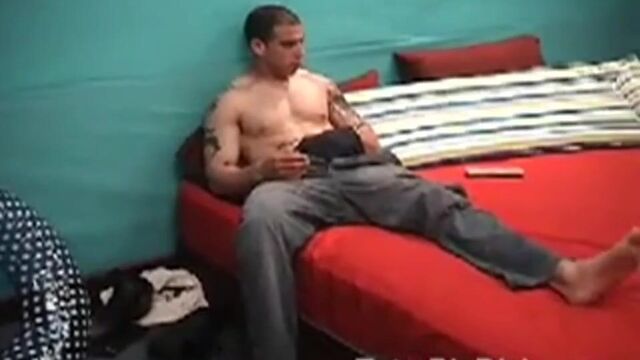 For the big meat fans out there, an extra big dick is welcome any place, any time. But for the true massive meat connoisseur, it's those places you would likely never find yourself where the ultimate big dick dreams leads you to haul out cock and star in the epic of your hottest desires. Picture yourself being tossed into Cell Block 8...you know you always wanted to share space with those men from Oz and wanted a cellmate like Duke: Incredibly straight, covered in ink, mean looking, tight bodied and a basket that won't quit and a sex drive to match.Duke is your hottest fantasy and biggest nightmare all rolled into one. He just drips 'badness,' yet when he smiles, there is just a hint of the angelic young man this tough guy grew into. When he slides off his jeans, you can't miss the mound in his shorts and when those boxers hit the floor, he has the kind of cock we love: while still soft, he is longer and fatter than some guys are hard. When a flaccid cock is 6', we know were about to see a whopper and as he licked his fingers to rub the meaty head, it was long before he was at full mast, muscled thighs spread wide and working that pole that a man who loved his dick as much as you will.Letting go of that hard exterior but never loosening his grip on that big fat cock, Duke waves his dick to the camera man with a smile, delighting in the attention and liking how it felt to put on a show he had held inside for too long. Not much of a mover or a talker, then again, with a cock this fat and this long, he doesn't have to say a word. The bull size balls hang heavy too and when he lies back, the head pops out of the skin and lands with a thud on his tight inked abs well above his navel. He switches hands repeatedly as he jacks - as if stroking something that fat tired his grip. With no warning, he leans to the side, squeezes his meat in the middle and eight, count 'em eight ropes of cum go creaming out and project so far...take a good look at the cum stains on the bed that extend all the beyond the mattress!