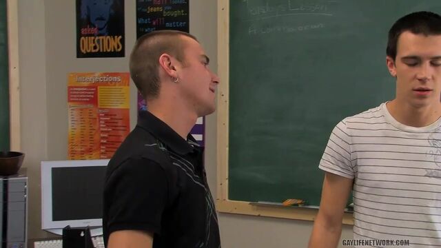 The adorable twinks Patrick Kennedy and Justin Giles are still in the classroom after everyone has left and that can only result in a wild and wonderful hardcore screw, as you're about to find out. They are beautiful young men and they kiss, caress and suck dick very well. Getting fucked on the teacher's desk is even more fun though and that's what you see.