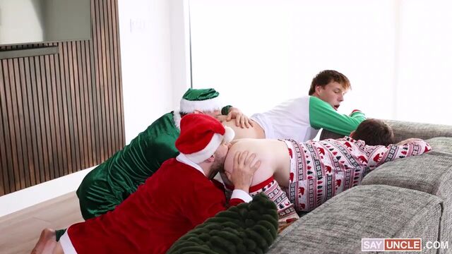 Dakota and Danny sleep on the couch on Christmas Eve expecting to see Santa and their gifts tonight. The surprise is even bigger when they wake up to find their stepdads Tristan and Nicholas dressed as Santa and his Elf and having some horny fun together. The boys don’t mind them playing naughty, as long as they invite them to join! The twinks open up their Christmas presents a bit earlier as they get to savor their stepdads’ cocks and get a jolly holiday ass-pounding.