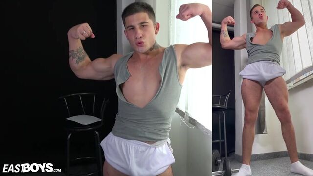 We have a cool athletic dude for you, Darion Kautzer. Big arms, big legs, strong body, and full of energy to show off his body. We set up a camera and let him improvise, flexing lifting weights. And as you can see near the end, there will be a sequel!