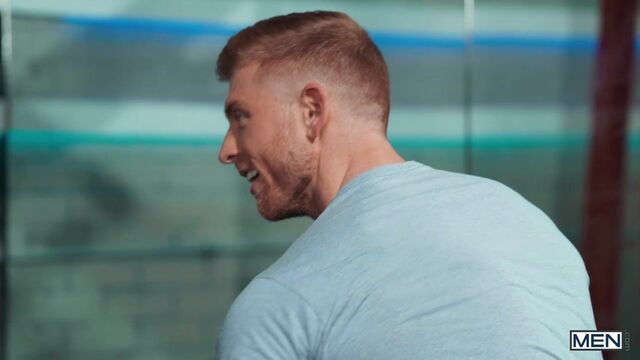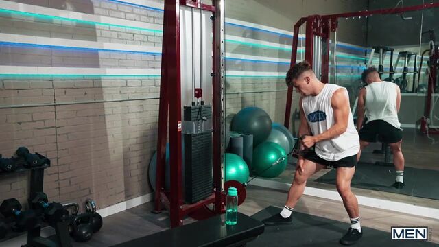 Matthew Ellis took a little too long with his stroke sesh before the gym, and when he realizes he's running late he accidentally grabs his stroker full of cum instead of his protein shake! After putting in some reps with his gym buddy, Trevor Brooks, Matthew tries to take a sip of protein and gets a face full of cum. Trevor has some more protein for his pal, taking out his hard dick for Matthew to suck. Trevor rims the bottom and Matthew rides that dick, then the top pounds him from behind against the mirrored wall. They fuck on the bench till Trevor gives Matthew a hot protein shot on his face while the bottom jacks off and cums.