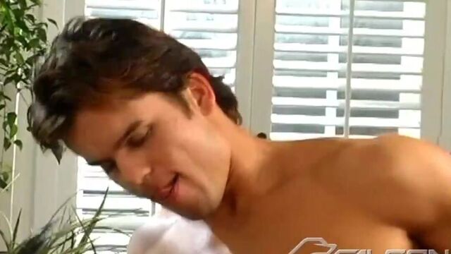 Pool-sharp Roman Heart persuades newbie Tony Martin out of his pants and spread eagle on the red felt behind the eight ball. The two take turns eating each other out with Martin impaling himself on top of Heart, bouncing and wincing the length of his shaft. Roman sinks both his cock and all his balls in the corner pocket shooting on cue all over his newbie's chest.