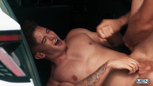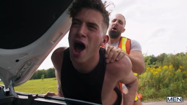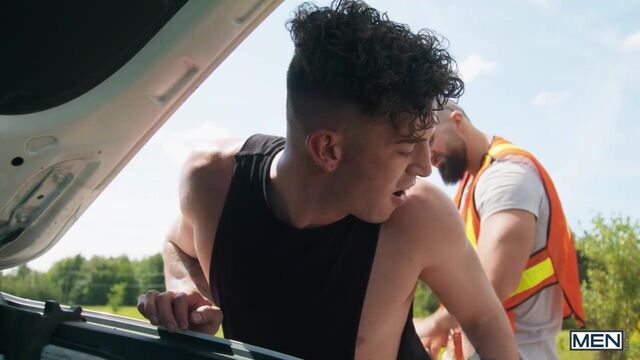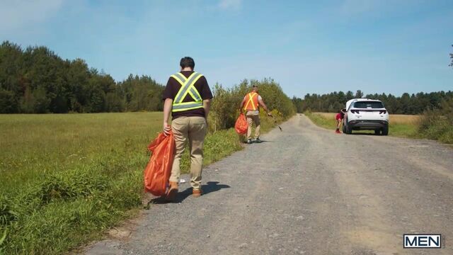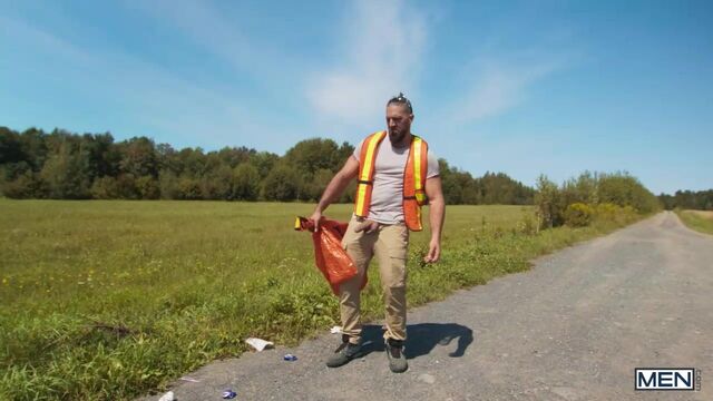 Chuck Conrad gets horny during his community service, but his trash picking partner doesn't want to get fucked. Luckily, the ex-con sees a car coming and flags down bottom Trevor Brooks with his big dick! Trevor pulls over and pretends to have some car trouble, and Chuck pulls down his shorts with his grabber, then introduces his huge cock to Trevor's hole! Trevor sucks the top, then Chuck pounds him in the tailgate of his car. Trevor rides the huge ex-con till he cums, and Chuck blows a load on his face. The guys are so distracted they don't notice another convict stealing Trevor's wheels!