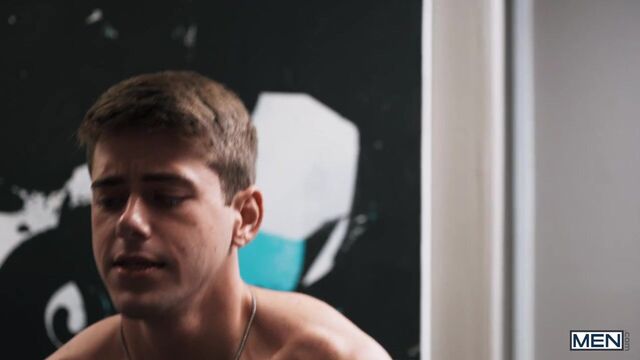 Officer Joey Mills got caught on tape sneaking into the evidence locker to jack off while sniffing boxers, then cumming all over them, and police chief Dom King won't stand for it! He makes Joey turn in his gun and badge, and also his complete uniform, including his boxer shorts, but Joey comes back into the office in time to catch the chief committing the same crime. Joey sucks Chief King, and Dom rims the disgraced constable, then gives him his nightstick on the desk. The chief pounds Joey in missionary and hoists him up for a stand and carry, then the twink rides him and cums on Dom's chest. Not even taking a facial from the chief can get Joey his job back, but at least the dirty cop got a good fuck.